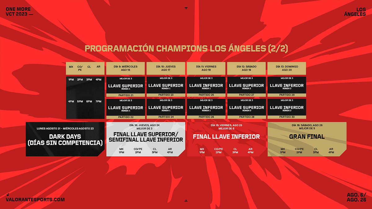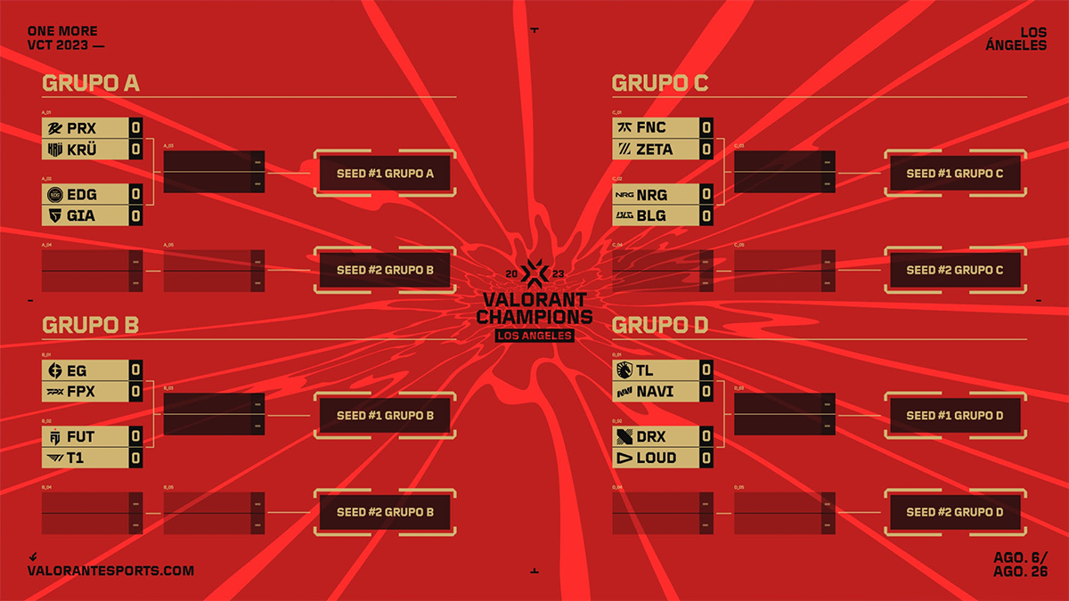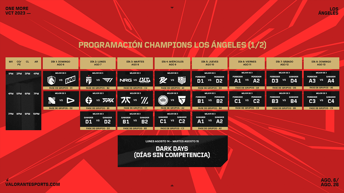 Champions es el evento final del VALORANT Champions Tour 2023 y representa la culminación de la temporada competitiva de VALORANT. A lo largo del año, los mejores equipos de todo el mundo compitieron en sus respectivas ligas internacionales y clasificatorias regionales para ganarse uno de los dieciséis lugares en el mayor evento internacional del año. Del 6 al 26 de agosto, los equipos clasificados se reunirán en Los Ángeles para competir por el trofeo de Champions y el título de campeones mundiales de VALORANT.